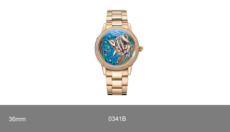 ROYAL ELASTICS此次針對台灣一級保育動物「石虎」做為愛護動物的主題,採用炫麗的蛋白石當做叢林的基底,運用彩繪的工藝手法堆疊出立體層次感,加上5顆天然真鑽象徵僅存的石虎數量五百,正因為需要如此繁複的工序才能體現珍貴稀有,好比ROYAL ELASTICS對台灣石虎的珍視一般。