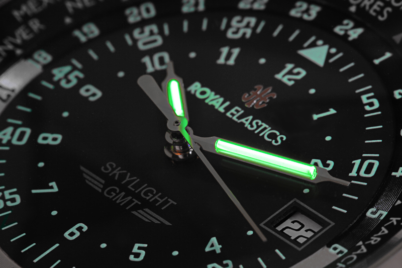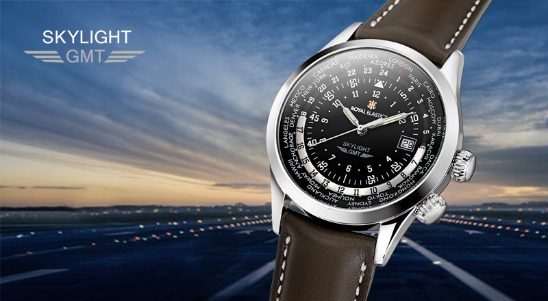 SKYLIGHT的設計理念源自於1939~1945年期間,空軍在執行任務時所配戴的飛行錶,這也是19世紀人類史上真正的把手錶配戴於手腕上的開端,過去飛官必須利用手錶上的計時器來計算飛航的往返行程,再用腕錶上特殊的飛行尺計算燃料及距離,因此ROYAL ELASTICS設計師運用這兩項功能重新朔造飛行概念,以符合現代大眾配戴飛行錶的用途。首先保留過去計時器上的時、分圈判讀用於日常計時,並替換飛行尺改為GMT世界時區,以達到旅遊及商業所需,輕鬆判讀各個國家的所在時間,而飛行錶一直以來都絕對是個經典的存在,ROYAL ELASTICS之選擇這樣的主題也是正逢2021年ROYAL ELASTICS創立25周年,所以我們誠摯邀請您與我們致敬夢想的起飛。