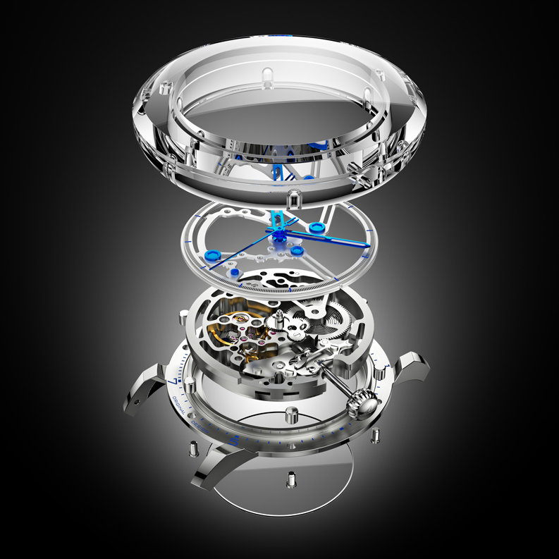 ROYAL ELASTICS近年來精進與各大錶廠一樣不斷追求材質技術的突破,創作出各式樣不同題材的錶款,啟發於源自黑洞UFO的造型概念,朔造出一體成型科技水晶錶殼,創造360度懸浮視角,打造出獨特品味的科技感。