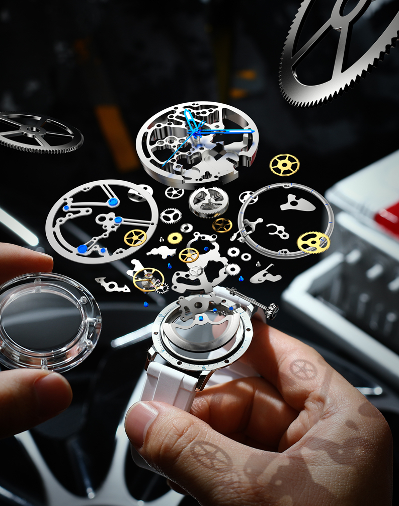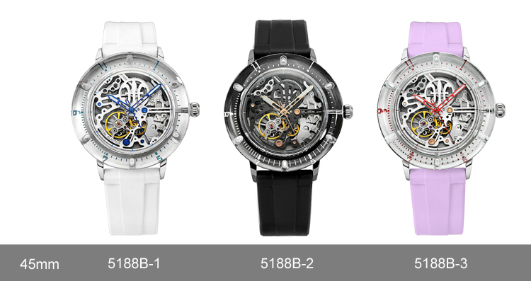 全新鏤空機芯面盤、科技水晶錶殼、快拆錶帶、三色選擇